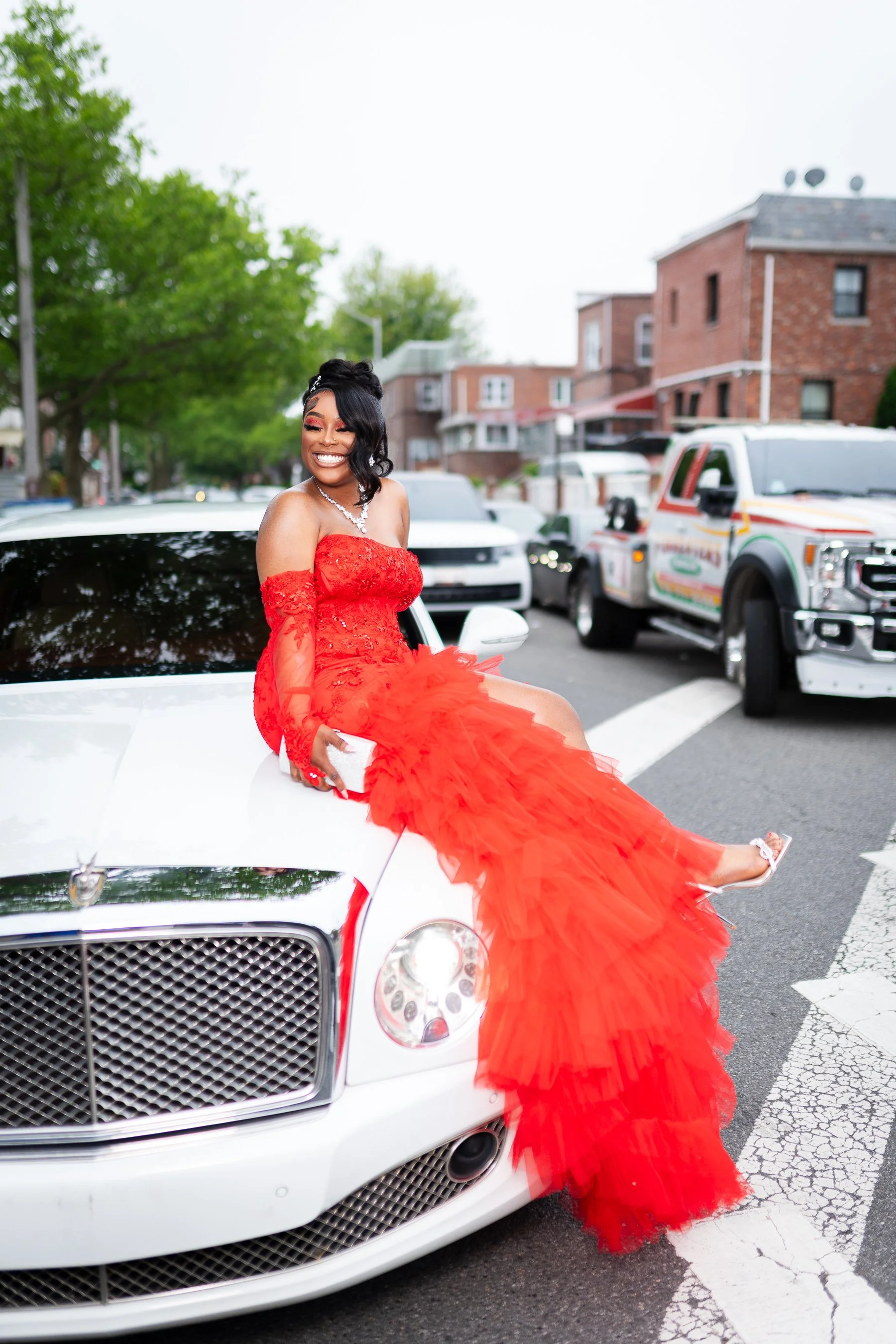 A woman in a red gown sitting on the hood of a white luxury car, smiling. She is in a street with cars and brick buildings in the background.