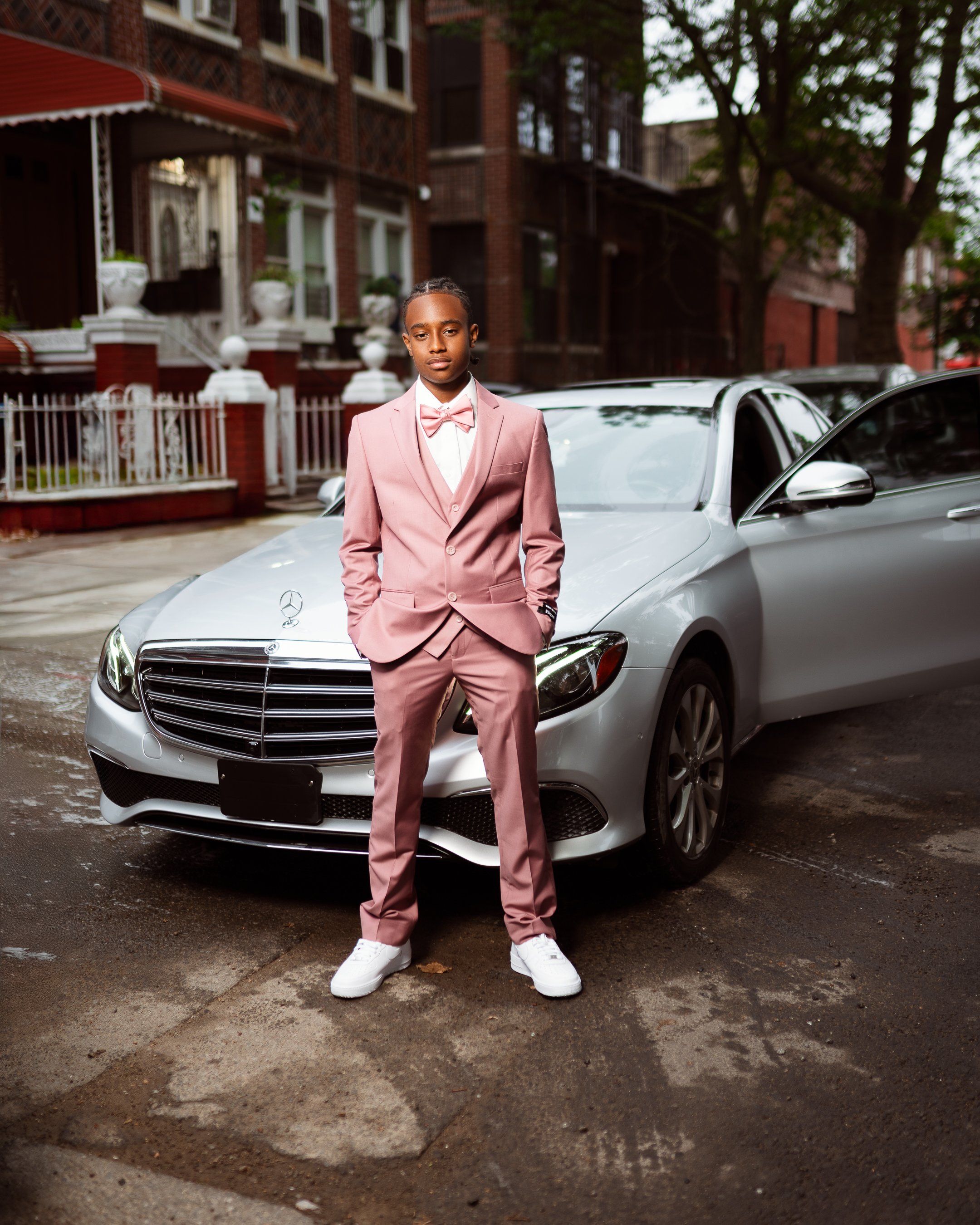 A young person dressed in a pink suit with a bow tie, standing in front of a silver Mercedes-Benz car on a city street with residential buildings in the background. View fullsize